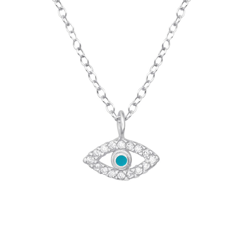 Strieborná retiazka a prívesok BOŽIE OKO. Dĺžka retiazky je 45 cm. Symbol božie oko má vsadených 16 krásnych žiarivých zirkónov.