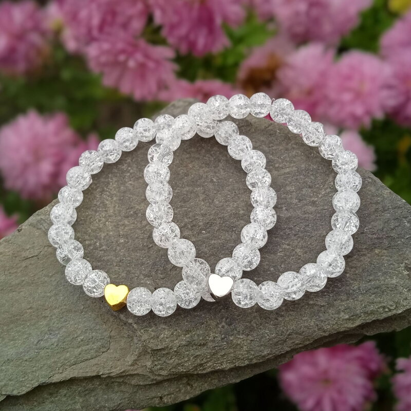 Náramok vyrobený z korálok syntetického praskaného krištáľu je doplnený o krásne lesklé srdiečko z chirurgickej ocele. Vyberte si zlatú alebo striebornú farbu ♡♡