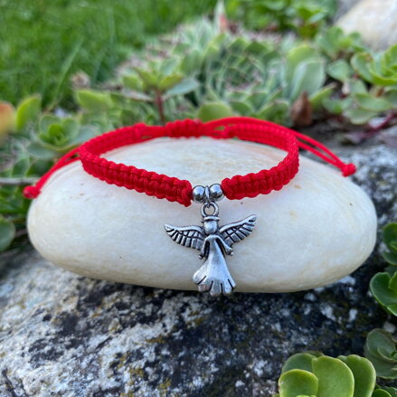 červený pletený sťahovací náramok, anjel z bižutérneho kovu