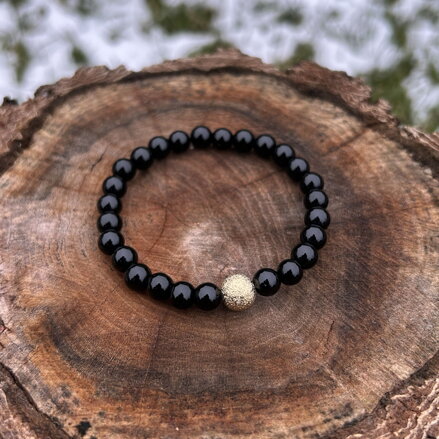 Náramok je vyrobený z lesklého Ónyxu a je doplnený zlatou trblietavou korálkou.